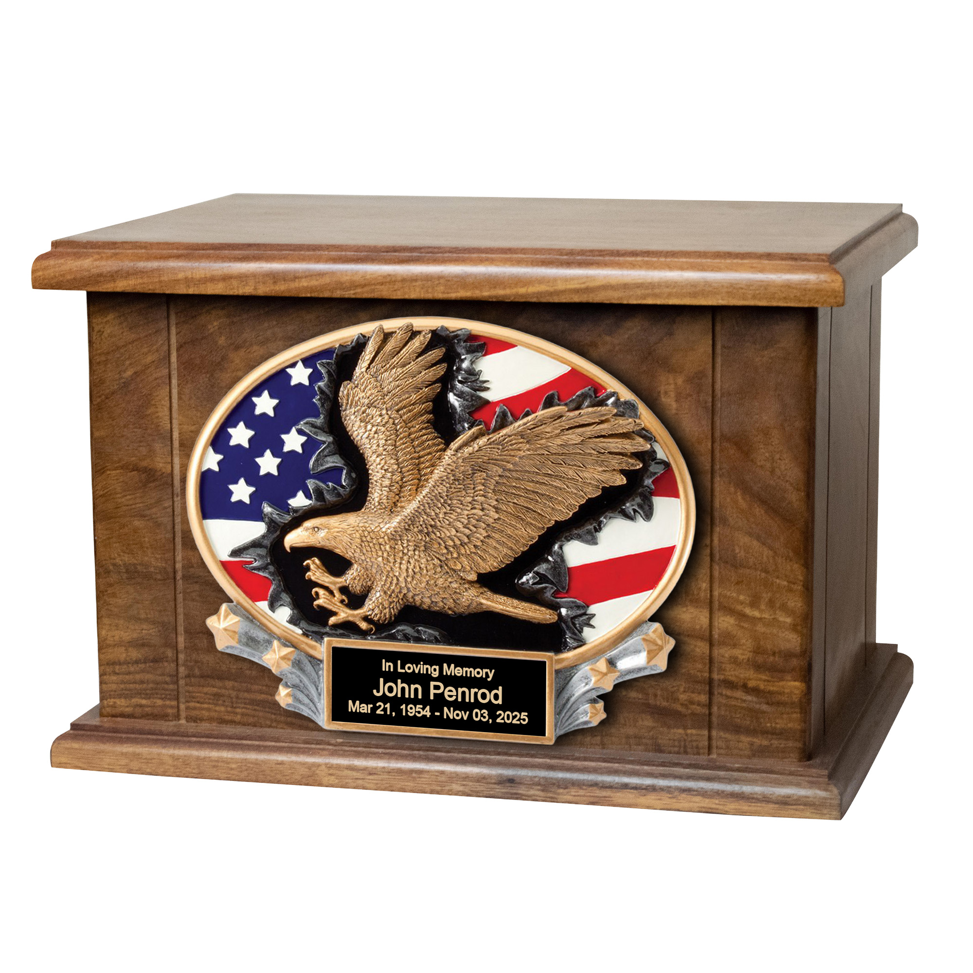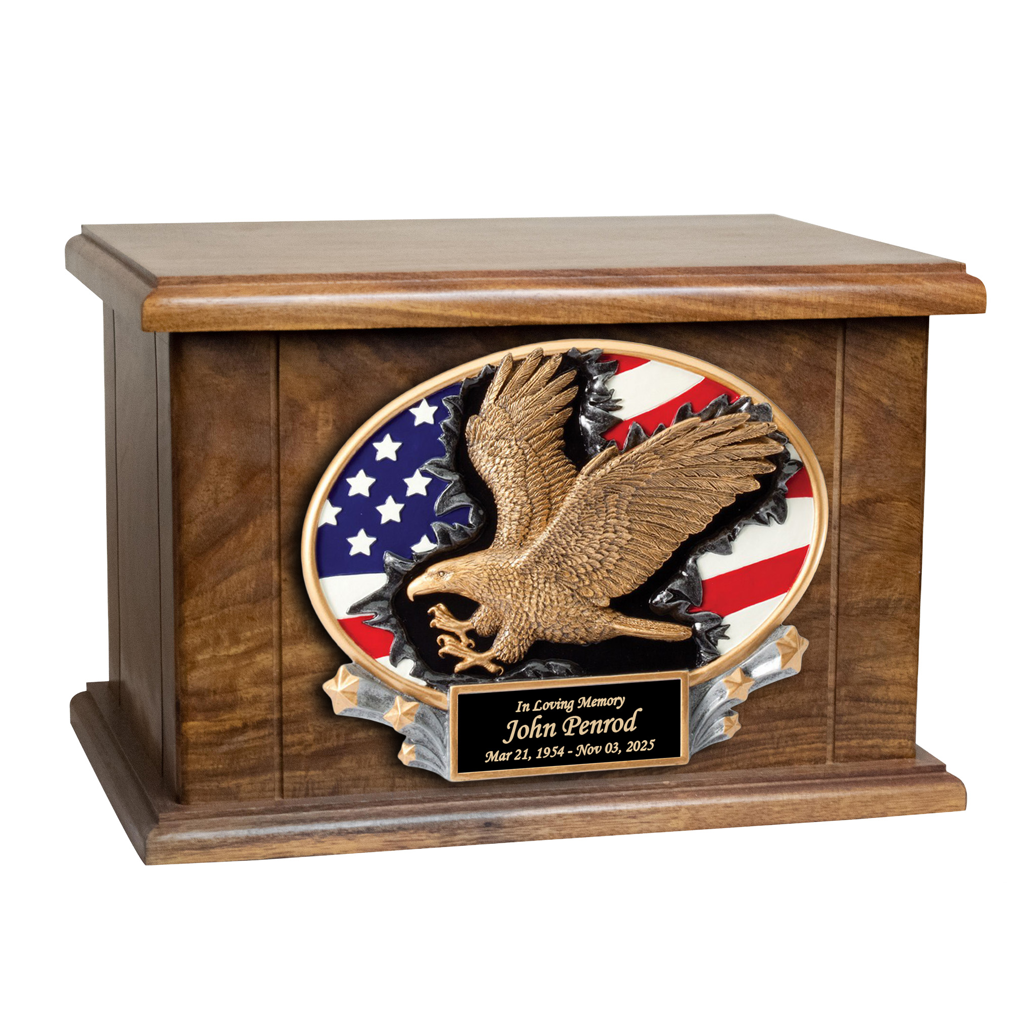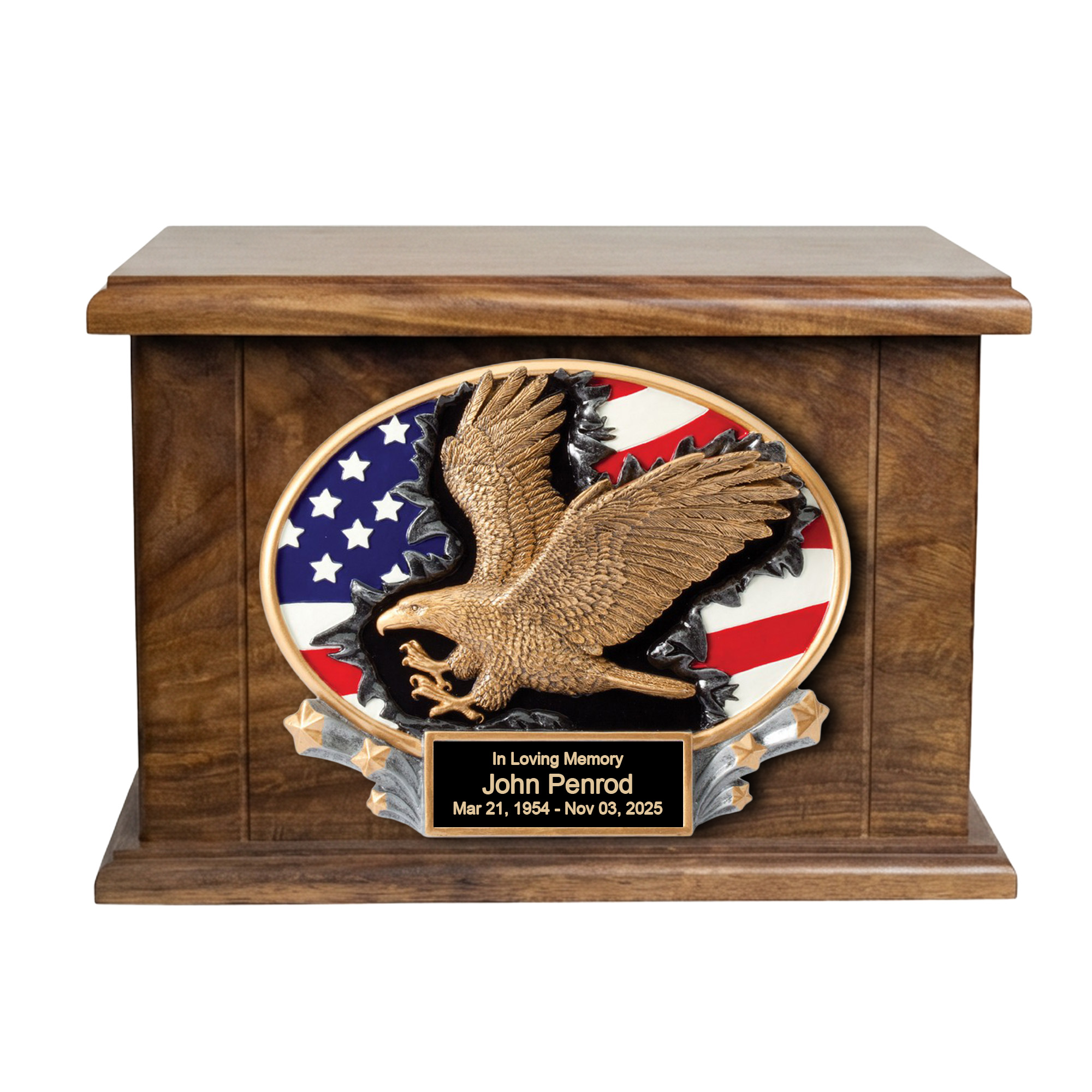 PROUDLY HONOR YOUR LOVED ONES: This adult size urn features a 3-D Eagle and flag resin and a personalized engraved plate to commemorate a loved one. It is an eye-catching work of art for your home that is perfect for nature-lovers while also serving as a lovely resting place for your loved one.